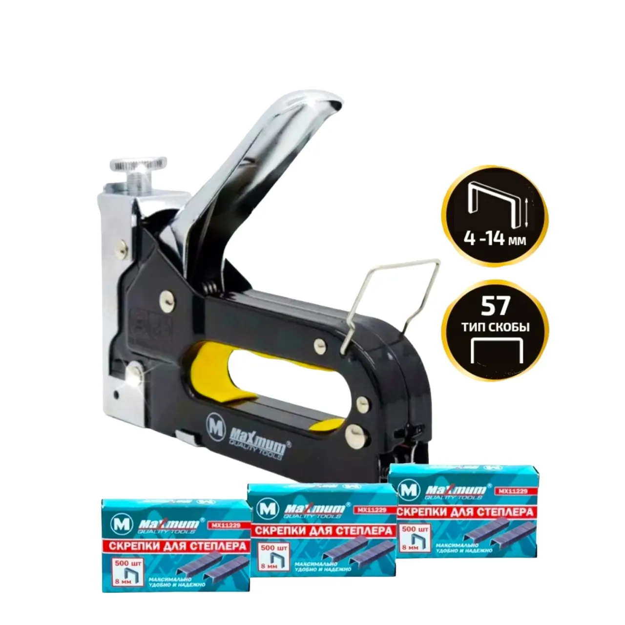 Степлер механический строительный и 3x500 скоб 8 мм от "MAXIMUM QUALITY TOOLS" незаменим при обшивке мебели, фиксации кабеля, крепления утеплителя или пленки к поверхностям. Мебельный степлер тип 57 предназначен для скоб 4-14 мм и имеет верхний регулятор удара и удобный стопор от случайного раскрытия рукояти. Надежный пластиковый кейс позволяет безопасно транспортировать и хранить инструмент. Благодаря регулятору натяжения пружины, можно легко подобрать оптимальную силу удара, чтобы не повредить рабочую поверхность и материалы для обшивки.
