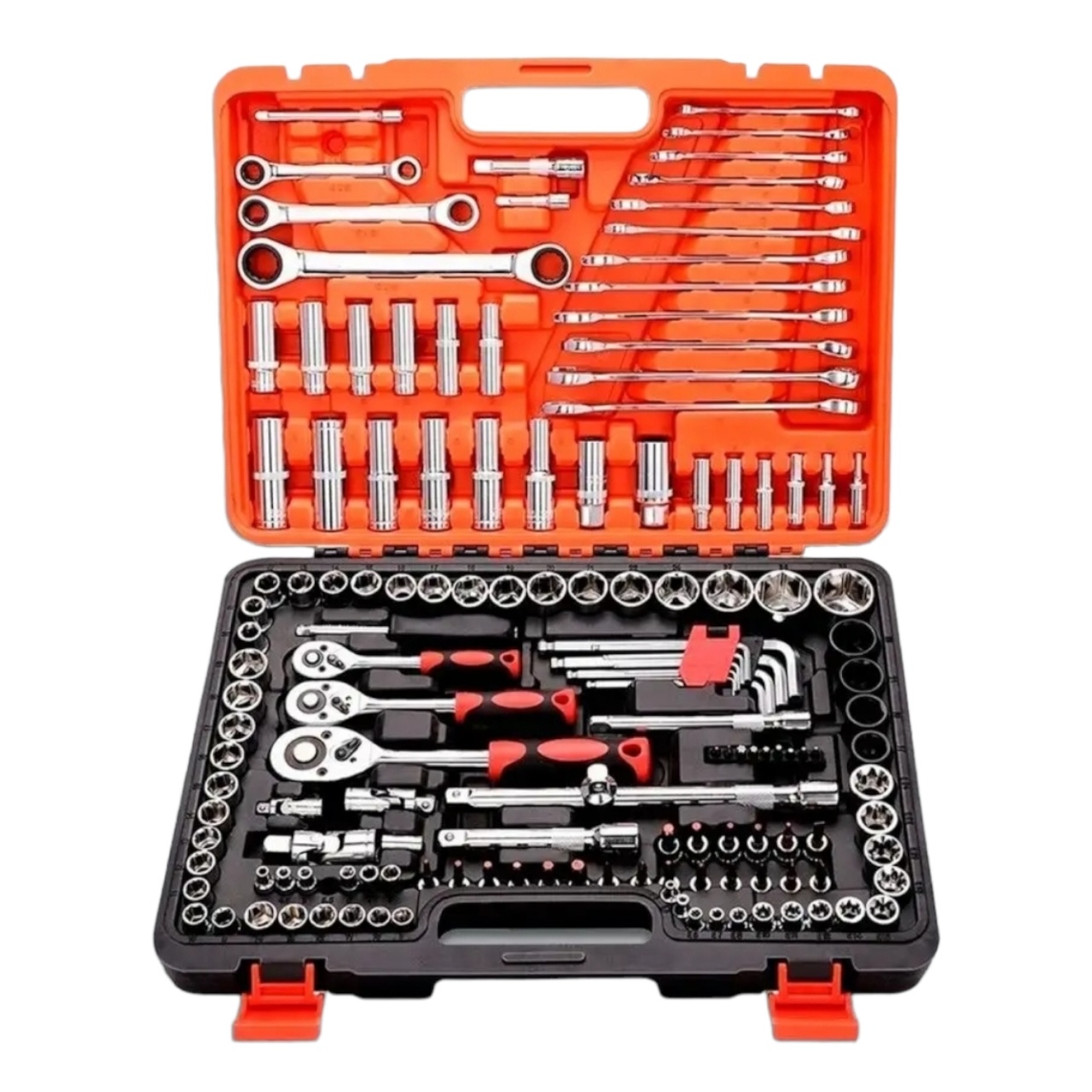 Набор инструментов автомобильный 150 предметов создан для профессионального использования в автосервисах. Рабочая часть всех элементов изготавливается из высокопрочной CRV стали, которая отличается устойчивостью к перепадам температур, влаге и механическим воздействиям. Рукоятки трещоток, воротка выполнены из двухкомпонентного материала высокой плотности, имеющего приятную бархатистую поверхность на ощупь. Все элементы имеют специальную маркировку с размерами. Набор упакован в прочный кейс, изготовленный из жесткого противоударного пластика и имеет надежные застежки.