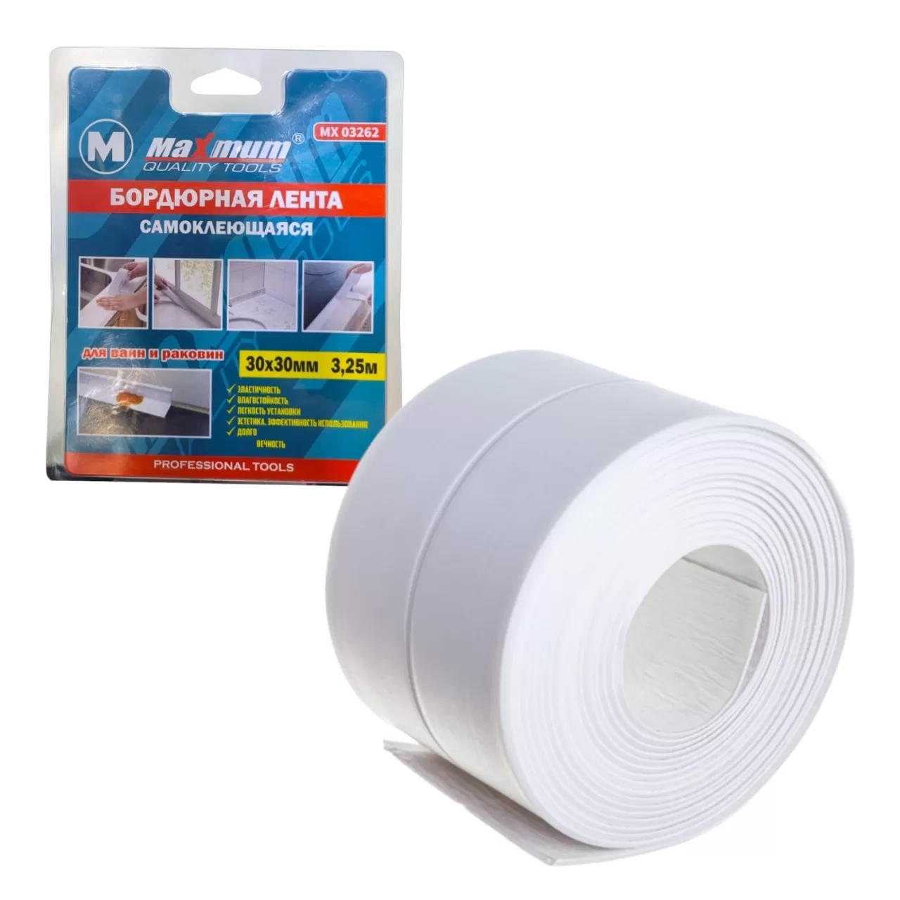 Лента бордюрная клейкая 3.25м×30мм×30мм для герметизации стыков ванн и раковин,"MAXIMUM" MX03262