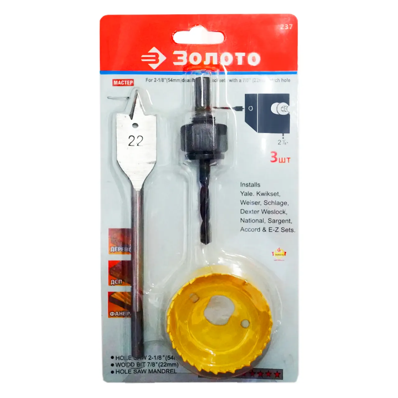 Набор для врезки замков включает в себя перьевое и центрирующие сверло с адаптером, также кольцевую коронку из стали с антикоррозийным покрытием, что обеспечивает долговечность, надежность и качество выполняемой работы. Диаметр хвостовика ¼. Набор предназначен для сверления по дереву, древесным плитам, пластику, гипсокартону и т.п. Стальные зубья твердосплавной коронки создают идеально ровные круглые отверстия.
