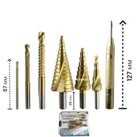 HSS сверла в данном наборе универсальны и различны по своему типу и назначению. Набор включает в себя три ступенчатых сверла, три сверла-фрезы и кернер.